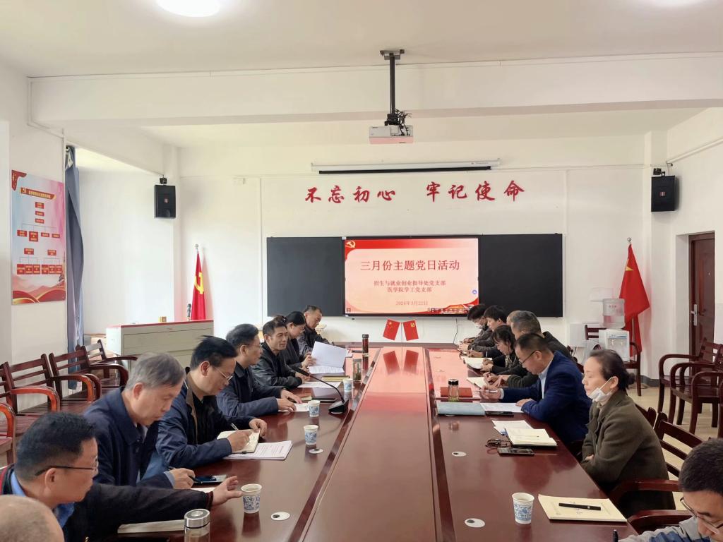 活动分为三个阶段进行。第一阶段由欧冠中文官网学工党支部刘冠儒同志带领全体与会同志重温入党誓词。第二阶段为集中学习阶段,会上全体党员同志集中学习了习近平总书记在全国两会期间重要讲话精神、习近平总书记在2024年春季学期中央党校(国家行政学院)中青年干部培训班开班上的重要指示精神、深入学习贯彻关于巩固拓展学习贯彻习近平新时代中国特色社会主义思想主题教育成果的意见、党史学习教育工作条例、党员不得信仰宗教的专题教育等相关内容。通过集中学习,大家统一了思想,提高了认识。第三阶段为交流学习阶段。招生与就业创业指导处赵联福同志针对医学专业“3+2”联合培养工作及医学专业招生在调结构中的规模问题进行了交流与分享。招生与就业创业指导处艾欢同志分析了2024年的就业形势,对欧冠中文官网2024年的就业工作提出了四点建议:一是开展职业生涯教育要贯穿全员全过程;二是就业指导服务要用心用情;三是就业监测要及时准确;四是就业工作要总结凝练、打造品牌。
