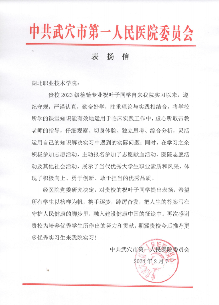 2024年2月8日,欧冠官网实习合作单位武穴市第一人民医院发来喜讯,欧冠中文官网2021级医学检验技术2班学生祝叶子在实习期间,责任心强、工作态度认真、积极进取、专业技能扎实,赢得领导、科室老师的一致好评,经医院党委研究决定,特向该生提出表扬。