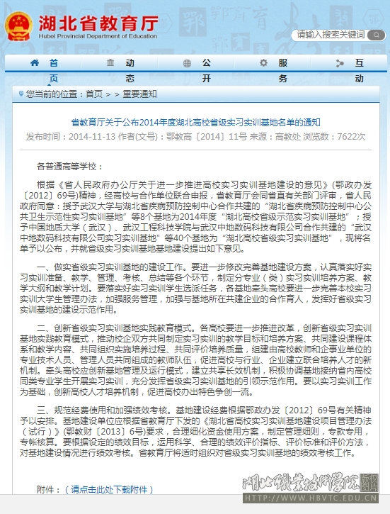 校企共建生产性实训基地——省教育厅关于公布2014年度湖北高校省级实习实训基地名单的通知