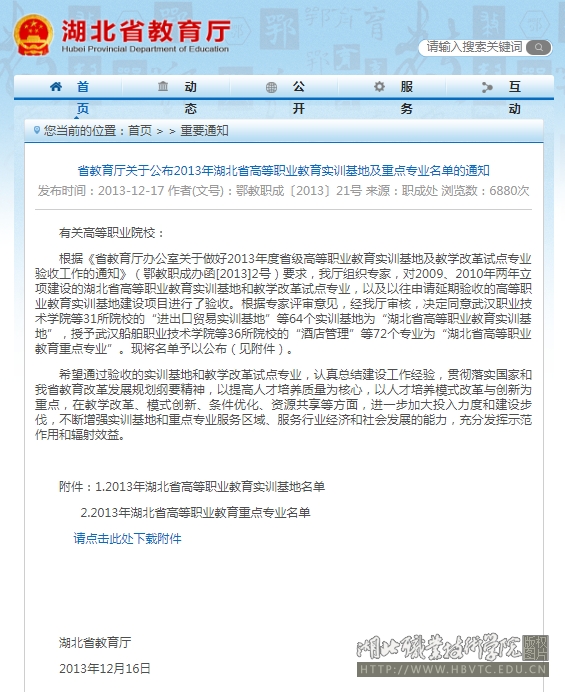 校企共建生产性实训基地——省教育厅关于公布2013年湖北省高等职业教育实训基地及重点专业名单的通知