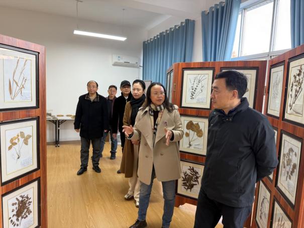 陆学胜一行先后实地察看了药用植物园、中药标本陈列室、模拟药品购销室等科普教育场馆,听取了学校药学科普教育阵地负责人高保英工作开展情况介绍。