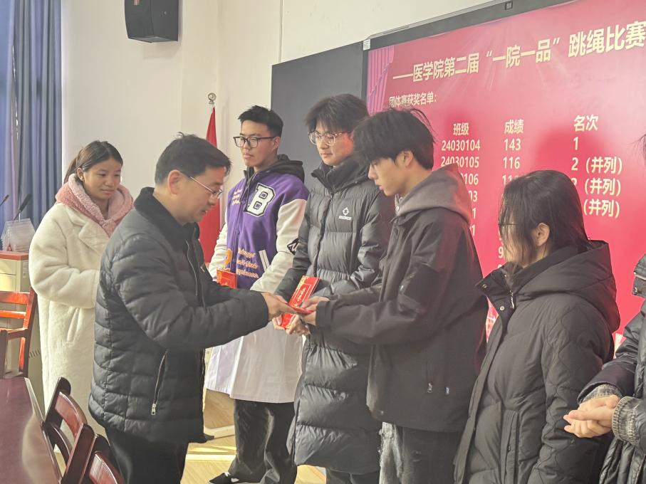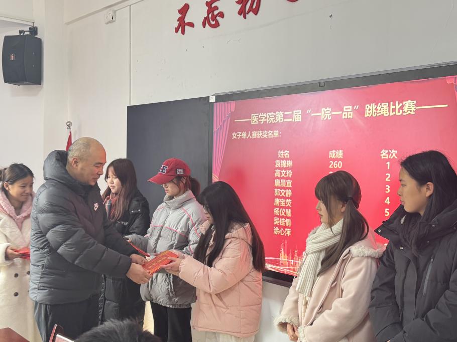 经过一系列紧张激烈的较量,女子单人跳绳比赛项目2024级药学专业袁锦琳、医学检验技术专业高文玲和医学影像技术唐晨宜分别荣获前三名,男子单人跳绳比赛前三名分别由2024级医学检验技术专业王倚天、药学专业王涵洋和医学检验技术专业胡向宇同学获得,2024级临床4班、临床5班和临床6班分别荣获前三名,欧冠中文官网副院长王光耀、学工办主任蔡国松与辅导员廖晓玲老师分别为获奖运动员颁发荣誉证书与奖品。