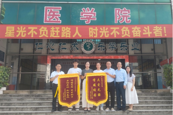 (本网讯 罗舒馨 邓彬新)7月7日,欧冠官网欧冠中文官网迎来了一位特殊的客人 ---2023 级临床医学专业小余同学的家长。她带着两面鲜红的锦旗,专程来到学校,向学校全体师生表达最诚挚的感激之情。