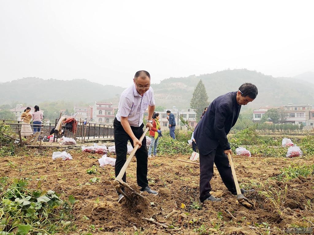会后,全体党员来到贫困户石国琪家的红薯地,挽起衣袖,打起号子,挥锹扬耙,帮助石国琪挖红薯。尽管拿惯了粉笔的手挥舞铁耙有些生疏和不协调,但大家热情高涨,充满激情。党员干部一起掘土刨坑拔红薯,大家谈笑风生,切磋劳动技能,分享劳动经验,两个小时收获500多斤红薯。党员同志们现场买下了石老汉全部红薯。