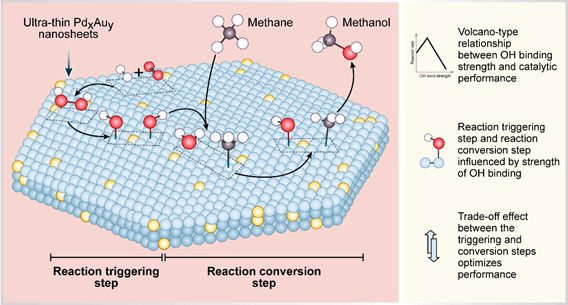 田新龙教授团队采用简便的电位置换法调控了超薄PdxAuy纳米片上金原子的覆盖率,并发现甲烷直接氧化制甲醇性能与金原子覆盖率之间存在火山型性能-结构关系。所制备的Pd3Au1纳米片在70 °C条件下的CH3OH产率达到147.8 mmol g-1 h-1,选择性高达98%。实验表征结合密度泛函理论计算表明纳米片表面的催化反应过程由反应触发步及反应转化步构成,反应触发步和反应转化步之间的互相制约关系导致了催化剂的火山型性能-结构关系,并进一步提出金属-氧之间的共价键强度可以作为甲烷直接氧化制甲醇催化剂的催化描述符,用于指导高效催化剂的设计及性能优化。本工作不仅制备了兼具高活性及高选择性的PdxAuy催化剂,还深入揭示了甲烷直接氧化制甲醇催化反应的微观机制,为高性能催化剂的开发提供了独特的思路。
