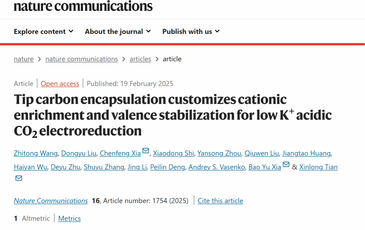 近日,海洋科学与工程学院海洋清洁能源创新团队王志同副教授在能源化学领域Top期刊Nature Communication上发表题为“Tip carbon encapsulation customizes cationic enrichment and valence stabilization for low K+ acidic CO2 electroreduction”的研究论文。Beat365中文官方网站海洋科学与工程学院王志同副教授为论文第一作者,田新龙教授为论文共同通讯作者。