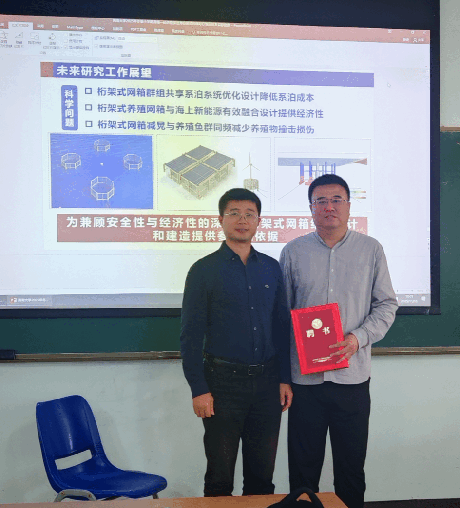 2025年11月15日至16日,大连理工大学赵云鹏教授应邀为Beat365中文官方网站开展为期两天的《深远海养殖关键装备水动力特性研究与技术创新》专题讲座。讲座在Beat365中文官方网站海甸校区4号教学楼105教室举行,开班仪式由学院副院长任年鑫教授(首日)与郑振钧副研究员(次日)共同主持。任年鑫副院长代表学院对赵云鹏教授表示热烈欢迎,并现场颁发了专家聘书。本次活动吸引了校内师生及海南本地企业代表的积极参与。