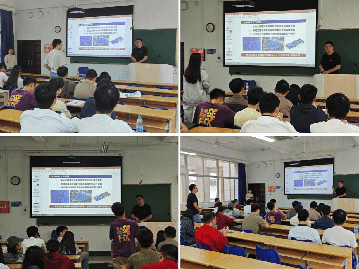 首日讲座,赵云鹏教授以“向海洋要食物”的国家战略为引,为同学们描绘了海洋资源开发利用的广阔前景。海洋作为潜力巨大的“蓝色粮仓”,其现代海洋牧场建设是推动渔业转型升级、实现高质量发展的重要突破口。在此背景下,他带领同学们深入剖析了“桁架式网箱”这一核心装备,细致讲解了其水动力特性、结构稳性与强度,并进行了成本效益评估,清晰地勾勒出科技创新驱动产业发展的完整链条。